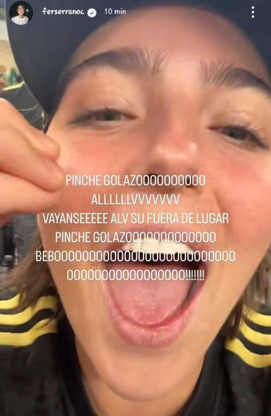 Fer Serrano, la esposa de Santiago Giménez, estalló de bronca en las gradas. La reconocida actriz y conductora realizó su descargo minutos después de la anulación del silbante. “Pinche golazo, ALV, váyanse ALV su fuera lugar. Pinche golazo Bebo”, compartió en sus historias de Instagram enfadada por lo que ocurrió con el Bebote.